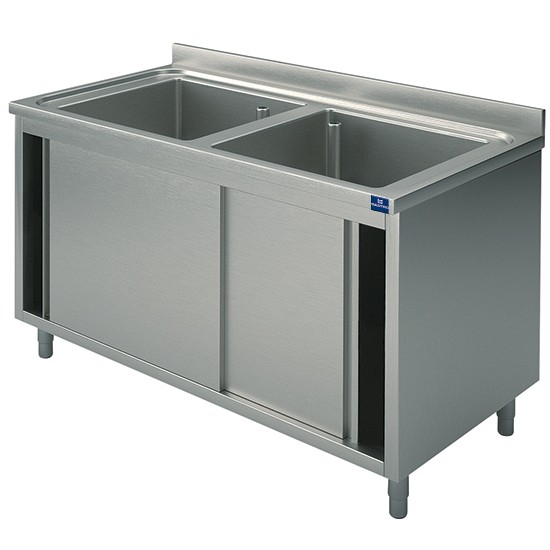 Piano di lavoro in acciaio inox AISI 304 spessore 10/10 satinato scotch brite altezza 40 mm e vasche complete di piletta e troppo pieno. Alzatina H=100 mm ricavata sul piano a raggio 5 mm. Struttura portante con fianchi, porte scorrevoli tamburate e ripiano inferiore posizionato a 150 mm da terra, realizzata in acciaio inox satinato scotch brite, dotata di piedini di livellamento regolabili in acciaio inox/nylon. Assenza di spigoli vivi.
